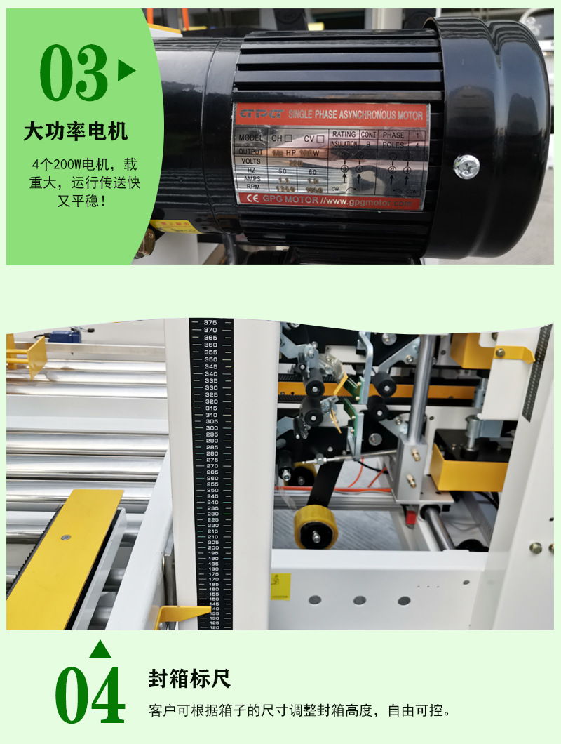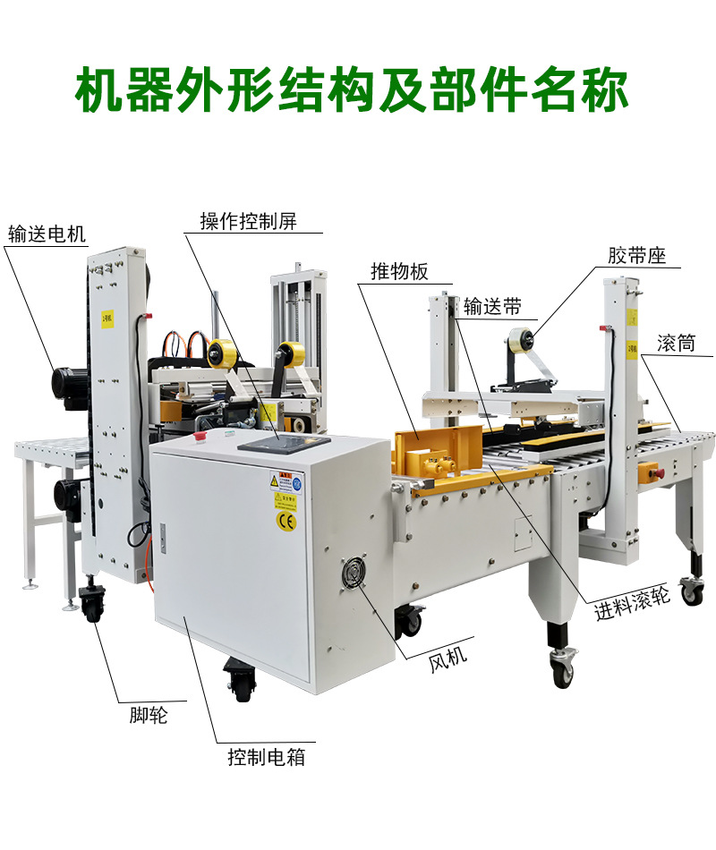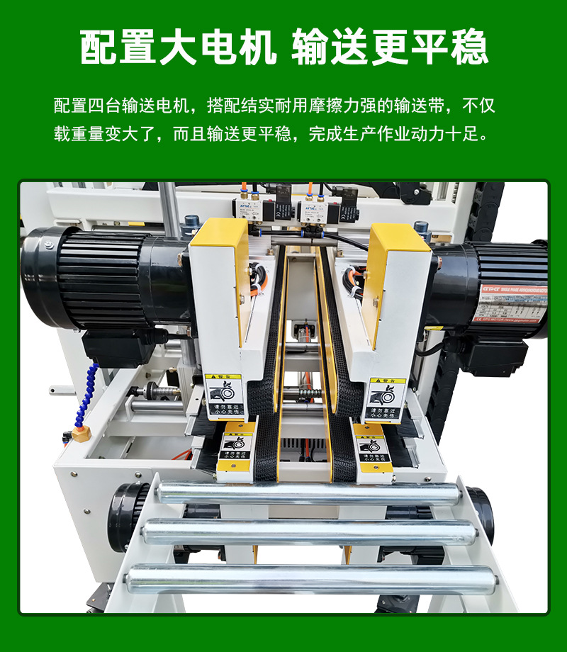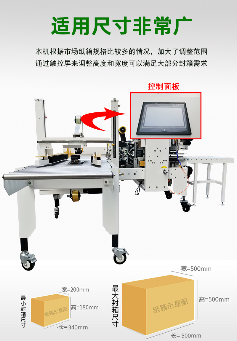 • 適應性強:得益于調節裝置,能夠輕松應對不同大小、長寬高各異的紙箱,滿足多樣化的包裝需求,減少了因紙箱規格變化而頻繁更換設備的麻煩。