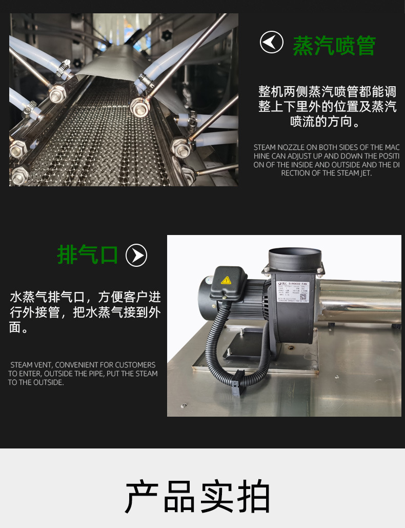 - 收縮品質優:對比電熱收縮方式,蒸汽的熱傳遞更均勻柔和,能讓薄膜完美貼合產品輪廓,杜絕褶皺、氣泡,包裝外觀十分精美。
