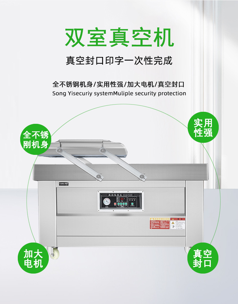 雙室真空包裝機是一種包裝設備,其主要功能包括真空包裝和充氣包裝。這種設備通過將包裝袋內的空氣抽出,達到預定真空度后完成封口工序,從而實現食品和其他商品的防腐、保質、防潮、防霉、防銹、防蝕、防蟲、防污染等目的