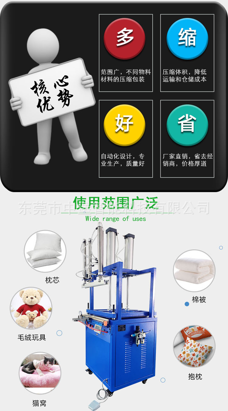 壓縮包裝機(jī)具有多種類型和功能。比如,有的適用于衣物、被褥等柔軟物品的壓縮包裝
